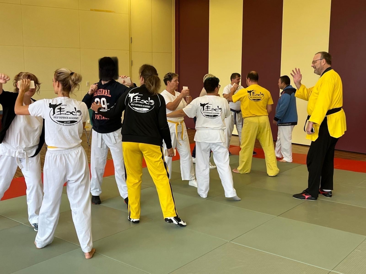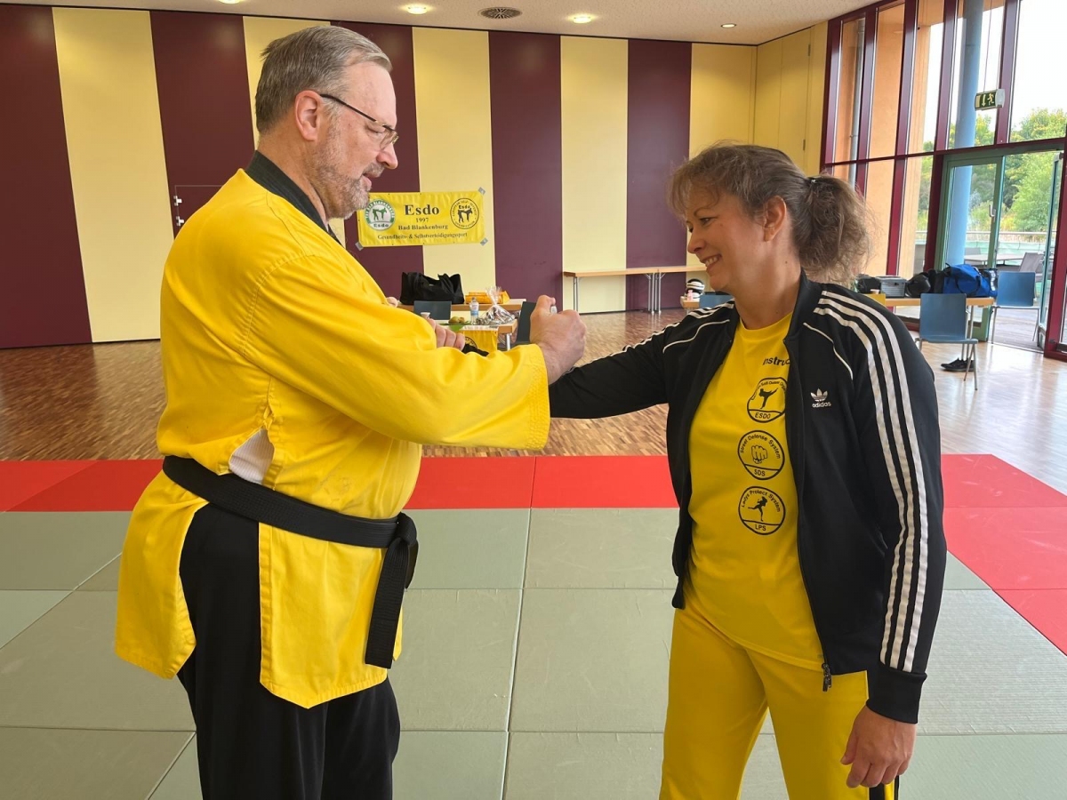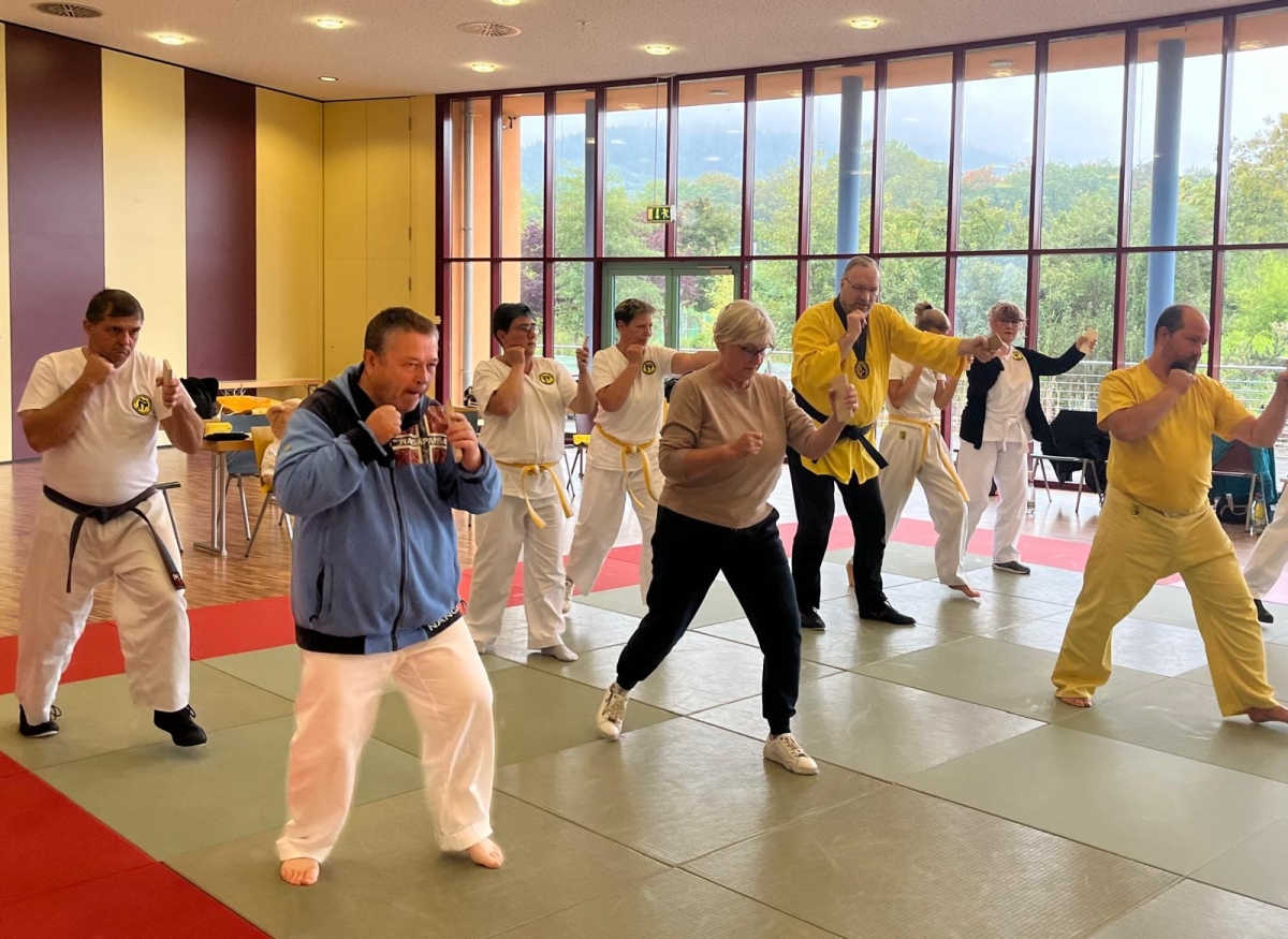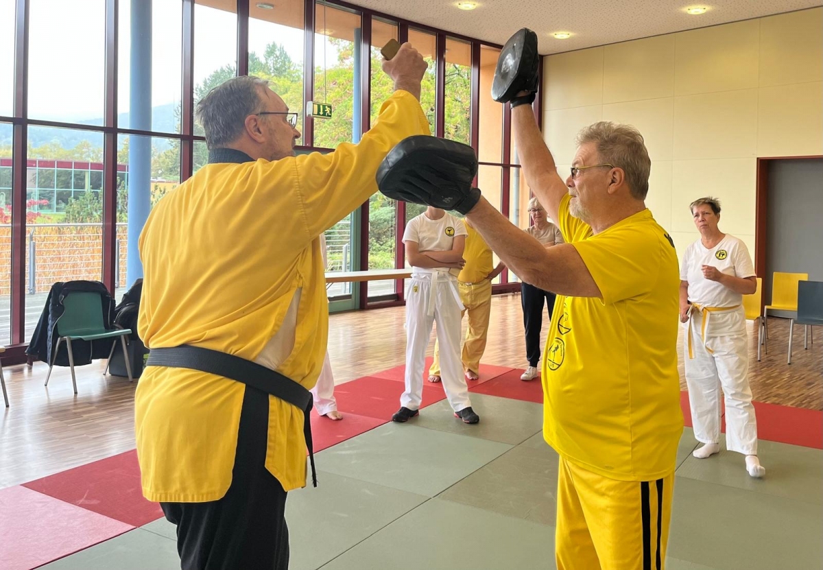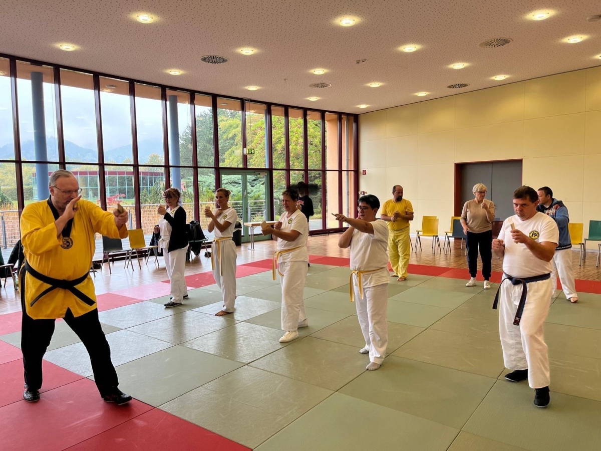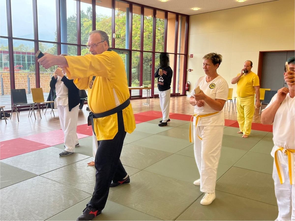 ![]() ![]() ![]() ![]() „Selbstverteidigung mit Hilfe des Handys“ - unter diesem Motto führten wir unter Leitung unseres Bundestrainers Kunibert Back am 27. September 2025 in der Landessportschule Bad Blankenburg einen Speziallehrgang durch, der großen Anklang bei allen Teilnehmern fand. Unser allgegenwärtiges Handy erwies sich als quasi perfektes Hilfsmittel bei der Abwehr von Angriffen. Es bereitete Allen viel Freude, gezeigte Techniken einzuüben und anzuwenden. Vielen Dank an Kunibert und alle Teilnehmer - gern werden wir zu gegebener Zeit eine Folgeveranstaltung organisieren. |
