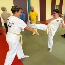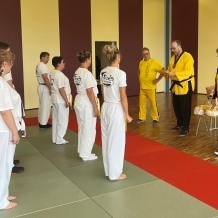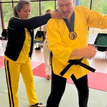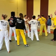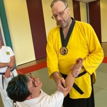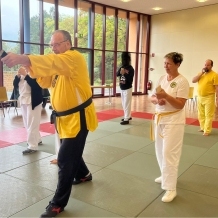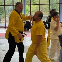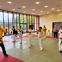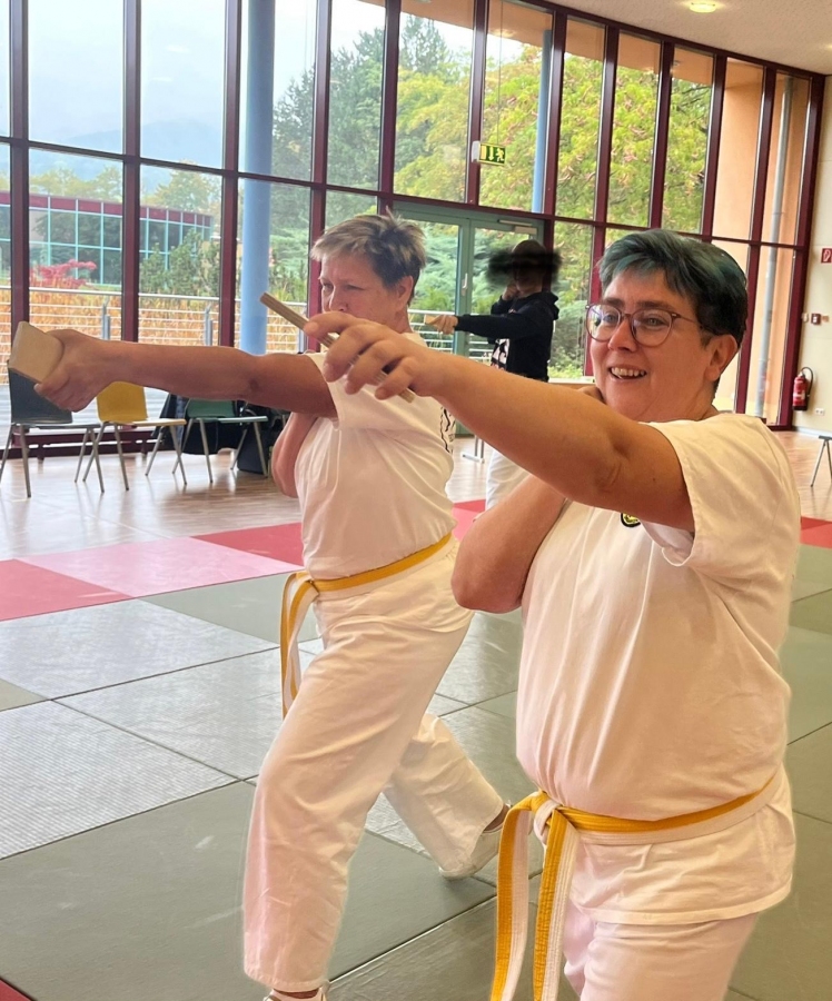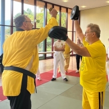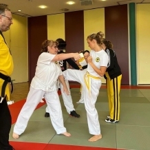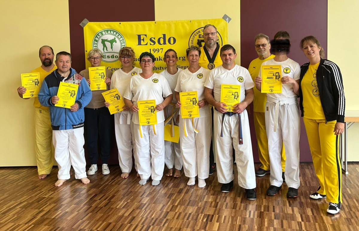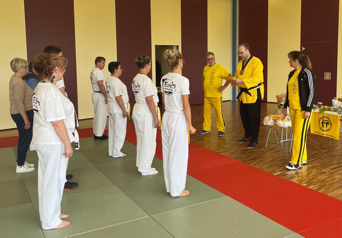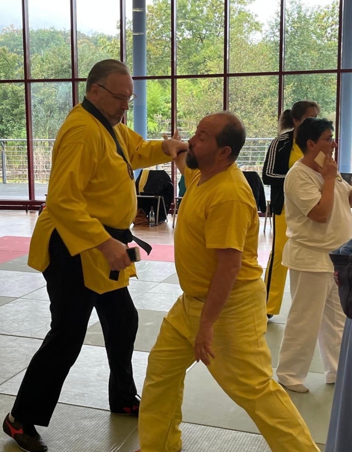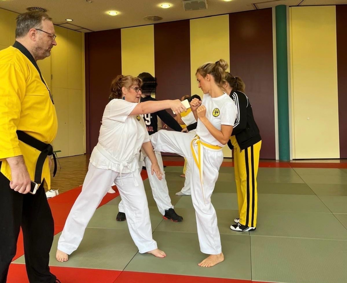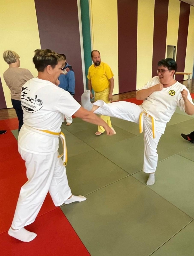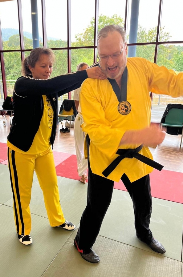 ![]() ![]() ![]() ![]() „Selbstverteidigung mit Hilfe des Handys“ - unter diesem Motto führten wir unter Leitung unseres Bundestrainers Kunibert Back am 27. September 2025 in der Landessportschule Bad Blankenburg einen Speziallehrgang durch, der großen Anklang bei allen Teilnehmern fand. Unser allgegenwärtiges Handy erwies sich als quasi perfektes Hilfsmittel bei der Abwehr von Angriffen. Es bereitete Allen viel Freude, gezeigte Techniken einzuüben und anzuwenden. Vielen Dank an Kunibert und alle Teilnehmer - gern werden wir zu gegebener Zeit eine Folgeveranstaltung organisieren. |